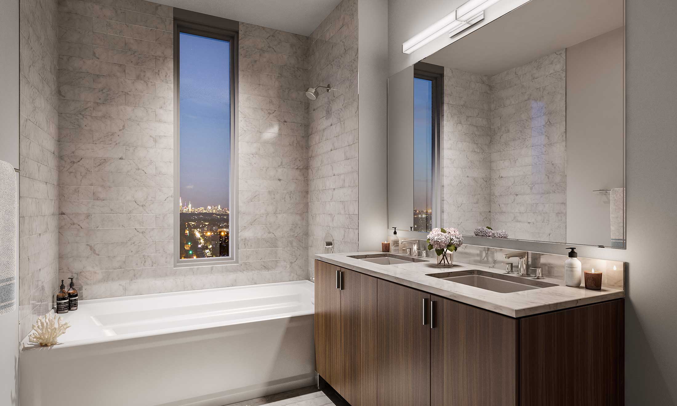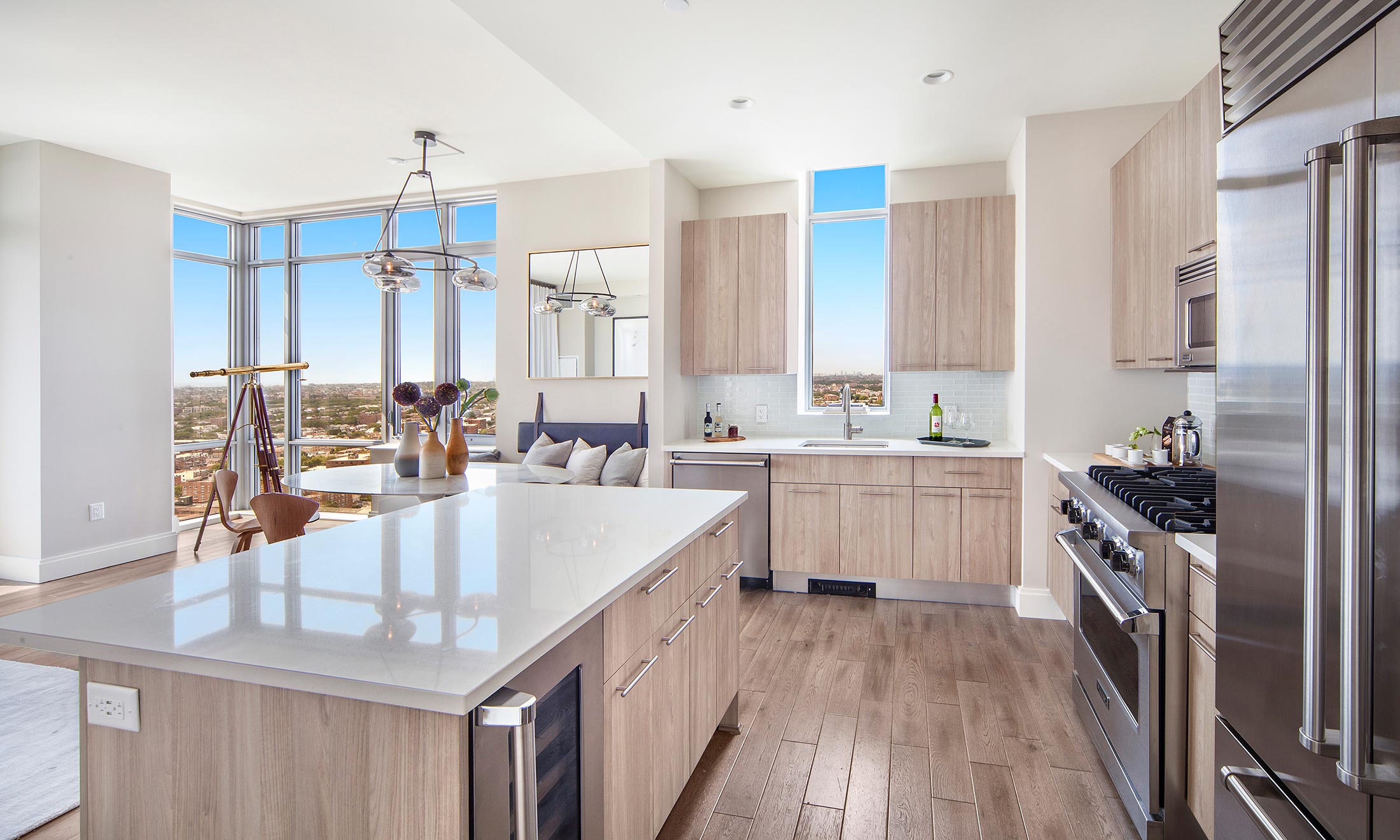 Three floors of penthouses sit atop 1 Brooklyn Bay, including two large three-bedroom homes with over 2,100 square feet of indoor and outdoor space on the 28th and 29th floors. On the highest floor, two grand four-bedroom penthouses offer spectacular aerial views and over 2,800 square feet of indoor and outdoor space. Penthouse kitchens feature a high-end stainless steel appliance suite that includes a Viking oven or double oven with hood, Sub-Zero 36” refrigerator and Viking wine cooler.