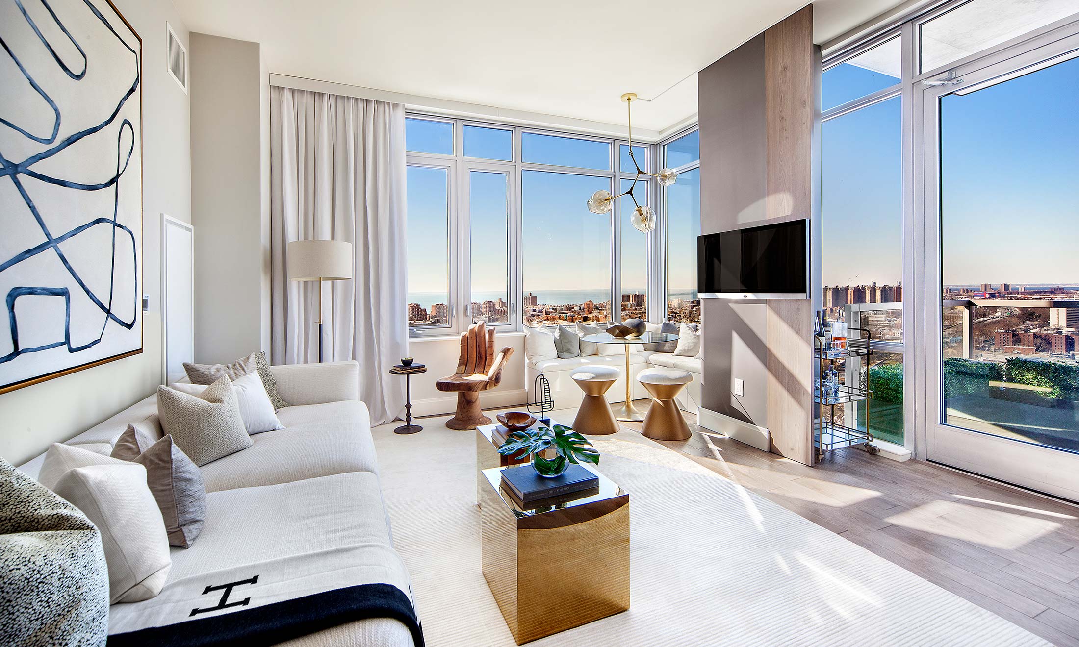With ceiling heights of ten feet or more and sweeping floor-to-ceiling windows, airy living areas highlight endless ocean and city views.